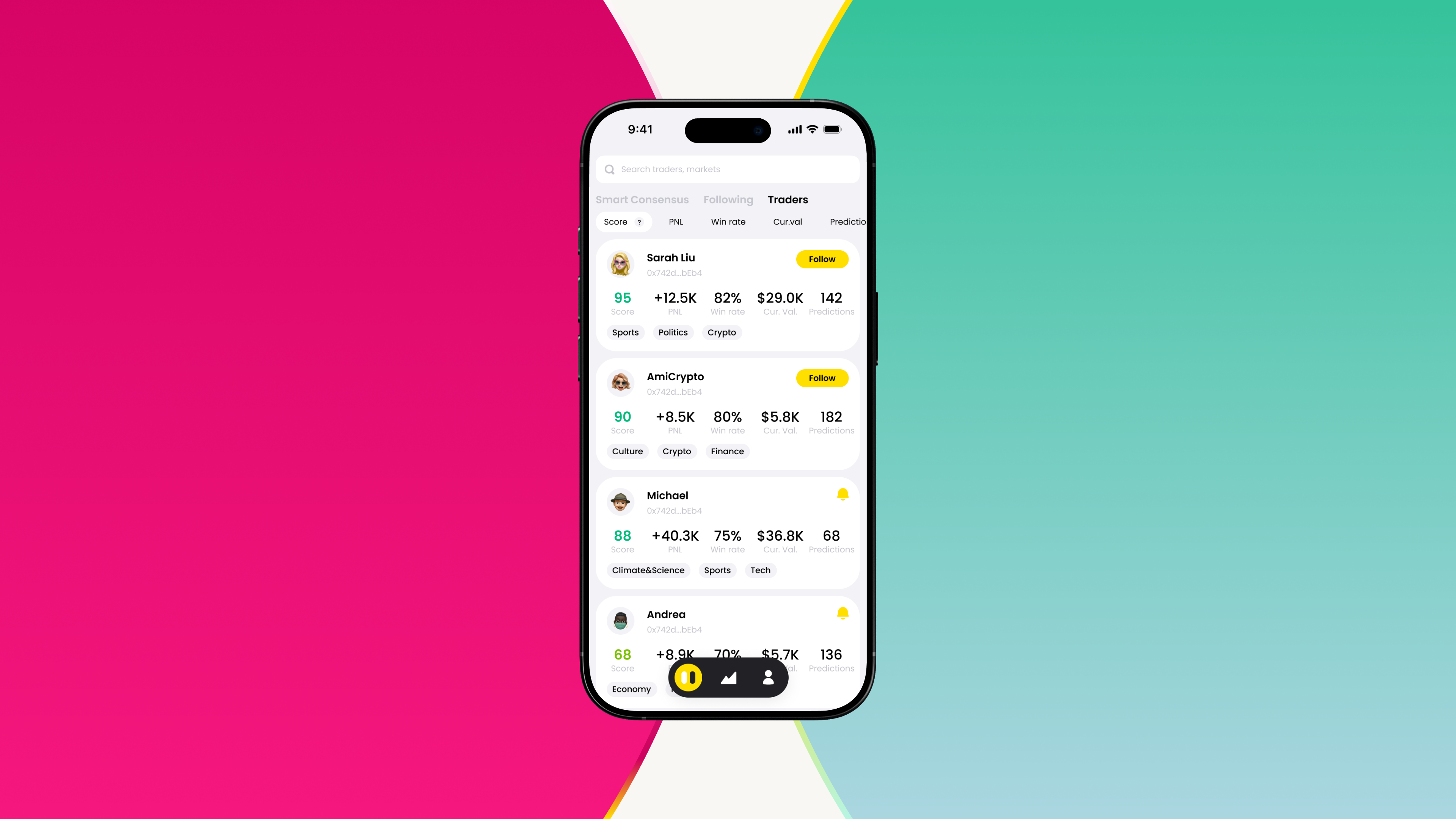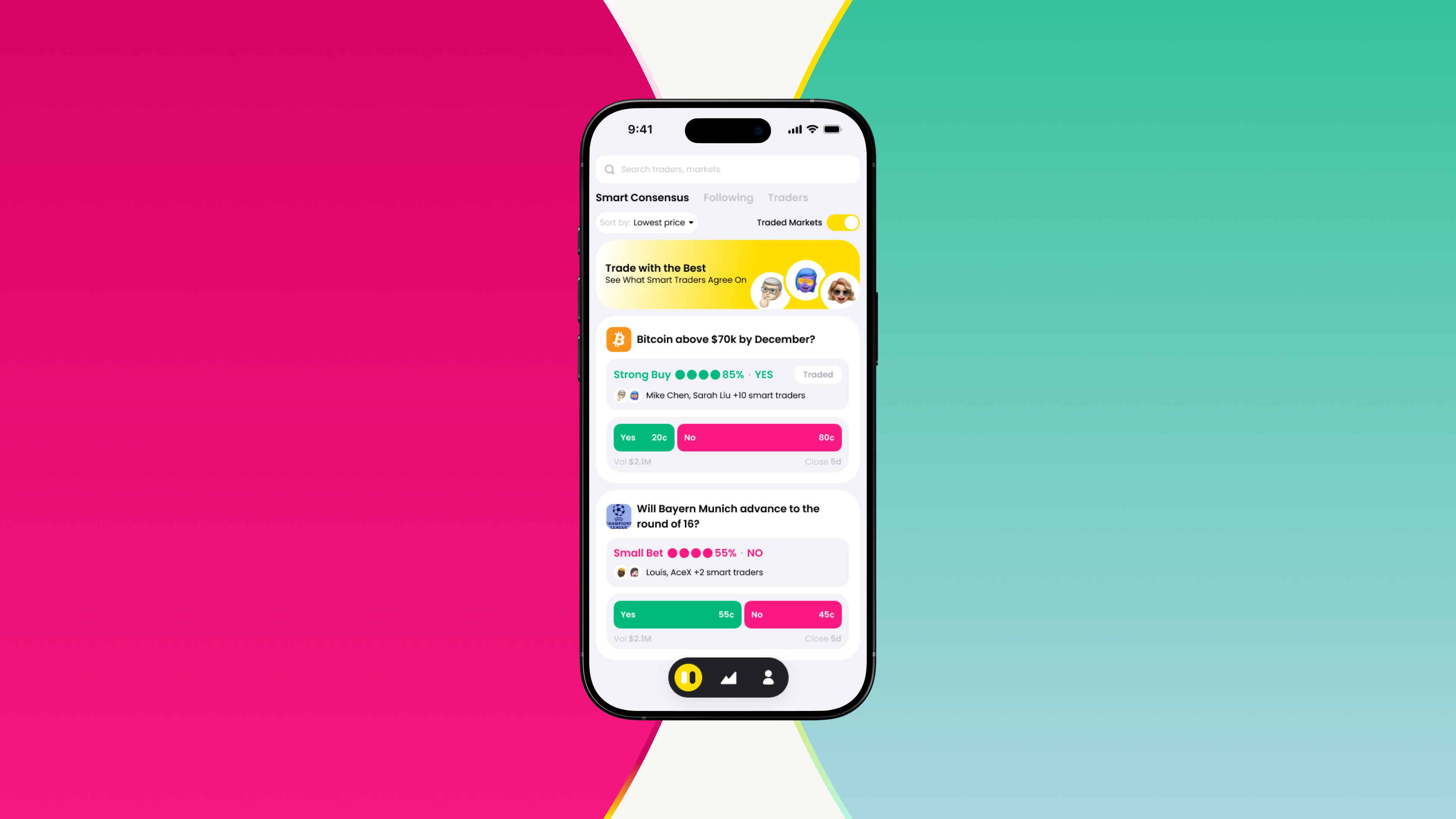 Ride aggregates trader activity, whale behavior, and position data into a real-time Smart Consensus score — helping you quickly see where the market is leaning.